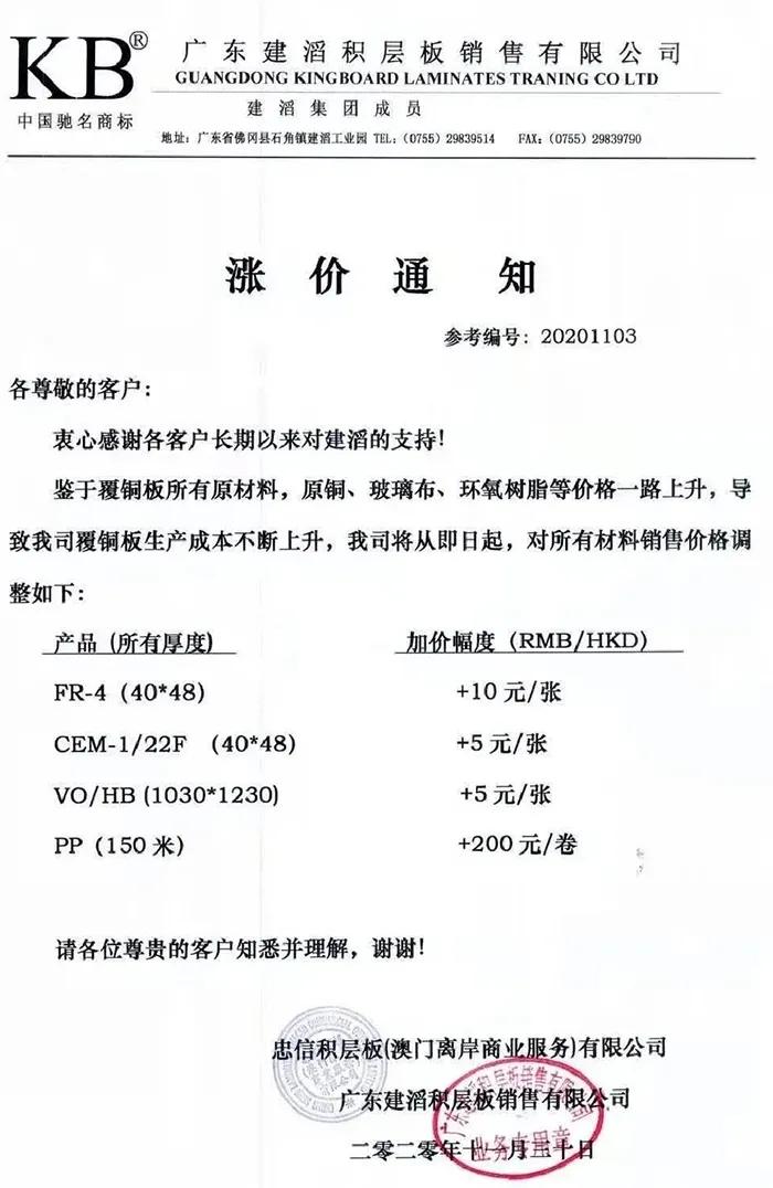 11月30日,建滔便发布涨价通知,通知指出鉴于覆铜板原材料,玻璃布、环氧树脂等价格一路上升,导致公司覆铜板生产成本不断上升,即日起对所有材料销售价格调整,其中FR-4(40*48)加价10元/张,PP(150米)加价200元/卷。具体详情如下: